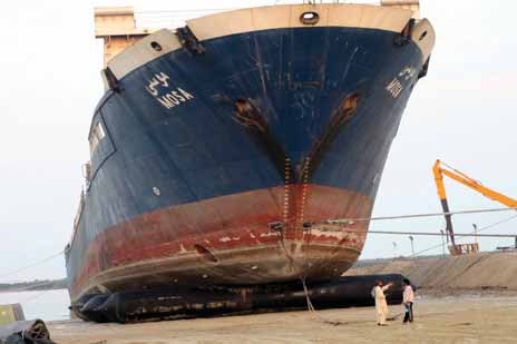 The docking ramp is composed of compacted natural sand and casting rocks. From the start of the ramp, 40 m long by 20 m wide area was covered by steel plates. The tide change of local sea level there is minimal, only 1 m difference with highest and lowest tide. Airbag ship docking technique takes advantage of the tidal change to insert balloons and pulling ship out of water. Little tide change caused this docking operation to be complicated and difficult.
