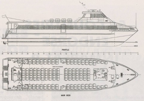 Passenger seating is arranged in a 2-5-2 configuration in fixed aircraft style chairs.Positioned at the forward end of the passenger saloon is the kiosk/galley. Adjacent to the kiosk, a stairway/hatch leads to the well equipped bridge. Access to the bridge deck can - also be gained via an aft stairway which additionally gives access to the engine room in the hull.