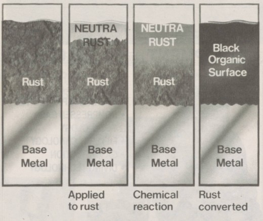 The continuous chemical curing of NEUTRA RUST forms a chemical bond with every metal interface, pacifying, neutralising and chemically converting rust. The black chemical compound layer is completely neutral and can be used as a primer, without further treatment, for standard or synthetic resin lacquers, oil-based paints, two component lacquers or bitumastic and oil tar-based finishes including micaceous iron-oxide paints.