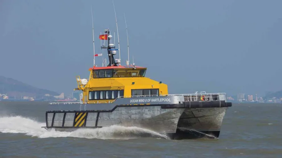 Catamaran hull optimizes stability and provides maximum comfort during operations to deploy technicians in wind-turbine operating zones