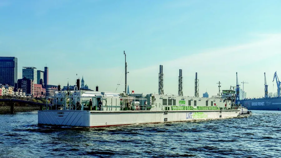 The barge, developed and operated by the Hamburg-based company, works like a floating power plant that, via a gas container filled with 15 tonnes of LNG ("Liquefied Natural Gas"), generates and transfers power to the ship. In doing so, the LNG Hybrid Barge emits no sulphur dioxide or soot compared to conventional marine diesel with 0.1% sulphur content. Emissions of nitrogen oxides and carbon dioxide are also significantly reduced.