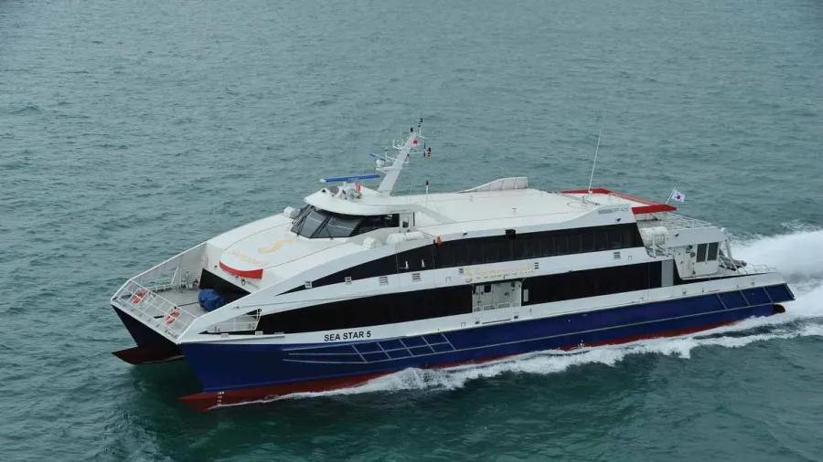 The DFF 4212 is a catamaran passenger ferry 42.2m in length with a beam of 11.6m. She will transport up to 450 people between Gangneung on the east coast of South Korea and the island of Ulleung-Do. The passenger capacity is distributed over the main deck, which can accommodate 306 persons, and the upper deck, which caters for 144. Powered by her four MTU main engines (16V2000 M72), Sea Star 5 can reach considerable speeds exceeding 40 knots.
